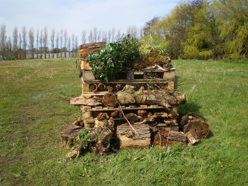 The Insect Hotel in the picture is built entirely from recycled materials. The main structure is discarded pallets, and much of the additional wood is the product of routine woodland management operations. Old pallets are used for the basic structure. The habitat does not need to be more than 5 pallets high. By placing the bottom pallet upside down, this creates larger openings at the ends, which can be used for a hedgehog house. The gaps are filled with dead wood which is essential for the larvae of wood-boring beetles. It supports many fungi, which help break down the woody material. Crevices under the bark hold centipedes and woodlice. Holes are homes for solitary bees and by filling the gaps with straw and hay this provides many opportunities for invertebrates to burrow in and find safe hibernation. The Insect Hotel has many different types of crannies and crevices that different species can hide in.